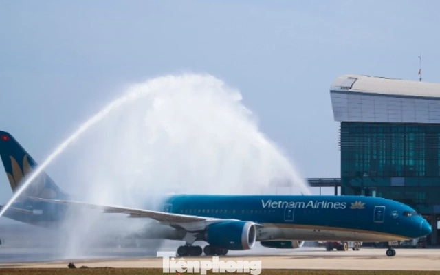 Lúc 8h10 ngày 19/12, máy bay Boeing 787-9 của Vietnam Airlines hạ cánh xuống Long Thành sáng 19/12, là chuyến bay thương mại đầu tiên hạ cánh xuống cảng hàng không này. Ảnh: VNA.