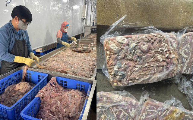 Kiểm tra khu vực kho lạnh của cơ sở, lực lượng chức năng ghi nhận khoảng 59 tấn lòng nguyên liệu được cấp đông trong 3 container, thời gian lưu trữ từ 4 đến 6 tháng; 01 tấn lòng đang trong quá trình sơ chế và 3,6 tấn sản phẩm đã qua chế biến.