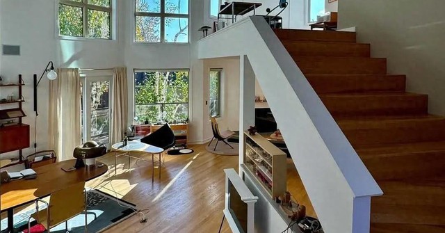 Căn nhà được bố trí rất tinh tế, kết hợp giữa phong cách hiện đại và chút hơi hướng cổ điển nhẹ nhàng. Không gian sạch sẽ, tối giản nhưng vẫn toát lên hơi thở nghệ thuật, mang lại cảm giác thư thái. Dù diện tích không quá rộng, trần nhà cao giúp căn hộ trở nên thoáng đãng, đồng thời không gian được phân chia khéo léo, hợp lý. Tường, trần và tay vịn cầu thang sơn trắng, không có vách ngăn rườm rà, tạo hiệu ứng thị giác mở rộng. Phía tầng lửng, hệ cửa sổ lớn tận dụng tối đa ánh sáng tự nhiên và khung cảnh bên ngoài, vừa thoáng đãng vừa trang nhã.
