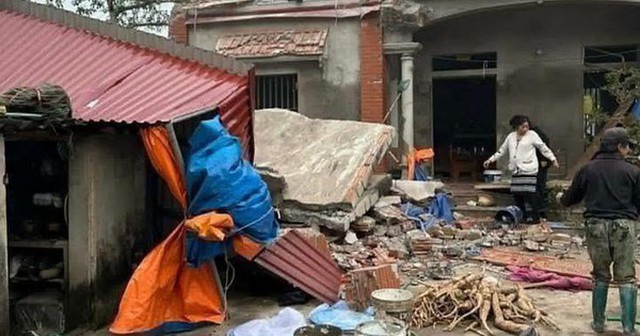 Tại hiện trường, ngôi nhà hai tầng bị phá hủy gần như toàn bộ tầng 2, tường và mái đổ nát ngổn ngang. Một số nhà dân lân cận bị nứt tường, vỡ kính.
