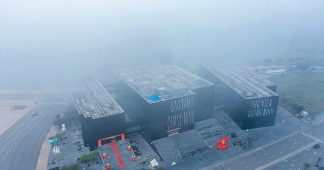 Cụm công trình thư viện và bảo tàng Quảng Ninh mờ ảo trong sương mù.