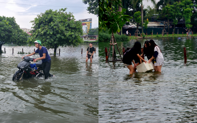 Trong bối cảnh giao thông khó khăn, không ít em nhỏ do được nghỉ học đã mang theo xô nhựa ra khu vực ngập để vui đùa, vầy nước. Một số nhóm bạn trẻ còn xách theo thùng xốp, rổ rá đi bắt cá tại những đoạn đường ngập sâu, tạo nên khung cảnh vừa lạ lẫm, vừa tiềm ẩn nguy hiểm.
