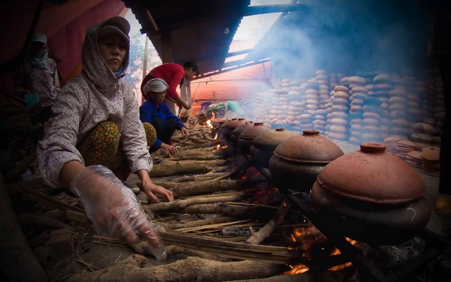 Những ngày cuối tháng Chạp, từ xa đã có thể nhìn thấy từng dải khói trắng bay lên liên tục trên một ngôi làng ven sông Hồng. Sân nhà nào cũng đỏ lửa, niêu đất xếp kín lối đi, người lớn trẻ nhỏ tất bật suốt ngày đêm. Không phải đốt rơm rạ, cũng không phải làng nghề gốm vào vụ cao điểm, mà là một món ăn quen thuộc đang bước vào mùa “chạy nước rút” trước Tết.