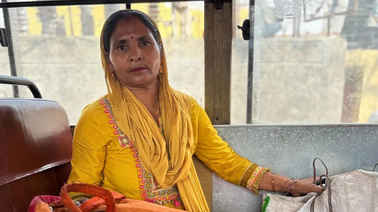 Bà Rajmani ngồi trên xe chờ đợi các con để cùng về quê sinh sống