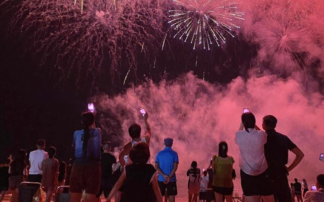 Vào khoảng 21h30, khi dòng người đang tản bộ dọc tuyến đường ven biển hoặc tụ tập trên bãi cát để tận hưởng không khí mát mẻ của thành phố biển, những chùm pháo hoa đầu tiên bất ngờ bắn lên trên nền trời đêm. Ánh sáng nhiều màu sắc phản chiếu xuống mặt nước tạo nên khung cảnh lung linh, khiến không ít du khách thích thú. Hàng trăm chiếc điện thoại được giơ lên để ghi lại khoảnh khắc hiếm gặp này.