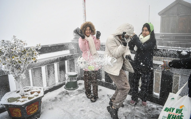 Cũng trong sáng 27/1/2025, khi tuyết đã rơi khá dày, nhiều du khách không bỏ lỡ cơ hội đi cáp treo lên đỉnh Fansipan để tận mắt chiêm ngưỡng khung cảnh đặc biệt này. Trên đỉnh núi, không khí rộn ràng hơn hẳn khi mọi người tranh thủ ghi lại những khoảnh khắc đáng nhớ bằng máy ảnh, điện thoại. Không ít du khách còn thích thú nặn người tuyết, ném bóng tuyết, tận hưởng cảm giác "chạm" vào mùa đông đúng nghĩa – điều vốn rất hiếm ở dải đất nhiệt đới như Việt Nam.