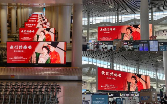 Theo đó, từ khu vực làm thủ tục, băng chuyền hành lý cho đến những màn hình lớn trong sảnh chờ, tổng cộng 88 màn hình cùng lúc hiển thị lời mời dự tiệc cưới, khiến nhiều người đi qua không khỏi bất ngờ. Hình ảnh nhanh chóng lan truyền khắp mạng xã hội với những bình luận hài hước: “Là mời toàn bộ hành khách đến uống rượu mừng sao?”