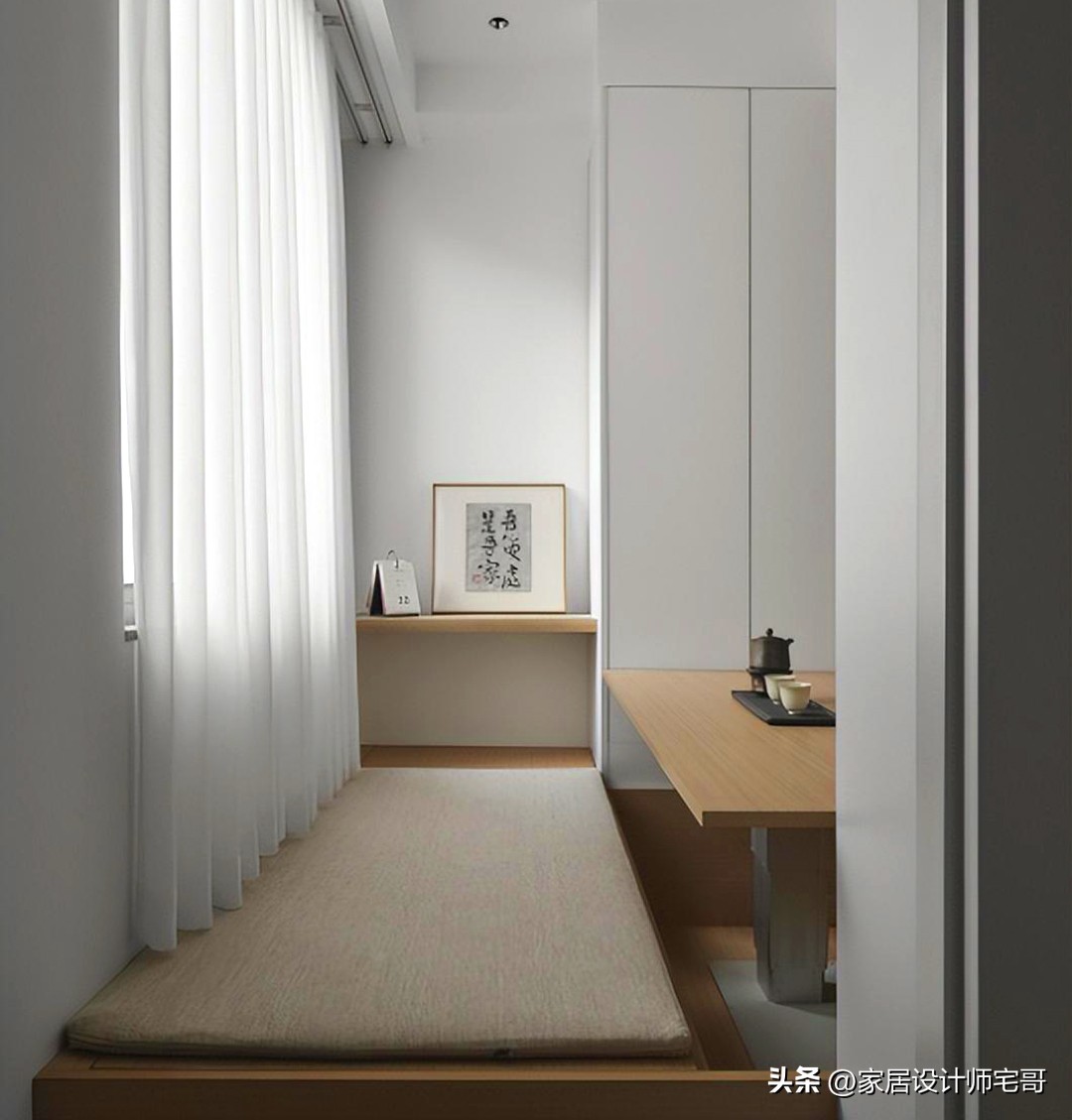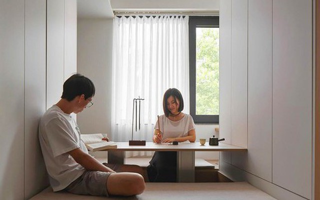 Ban công cũ được cải tạo thành khu tatami đa năng, có thể dùng làm góc đọc sách, làm việc hoặc phòng ngủ phụ khi cần. Bàn nâng linh hoạt giúp thay đổi công năng nhanh chóng, phù hợp với nhu cầu sống linh hoạt của người trẻ.
