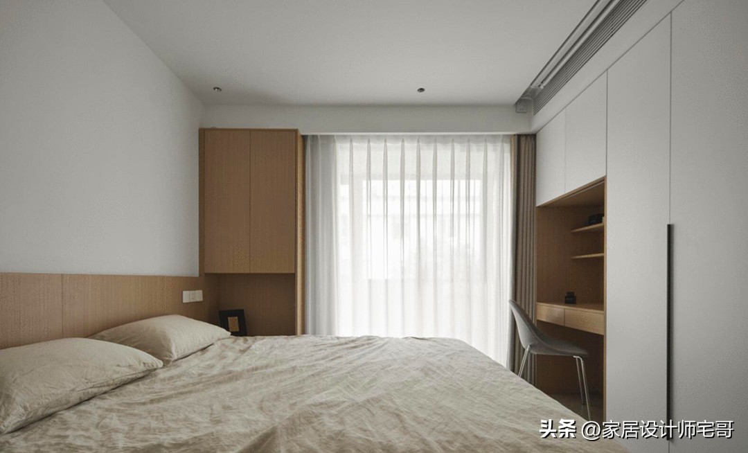 Phòng ngủ sử dụng tủ quần áo cao sát trần để tăng không gian lưu trữ. Việc tích hợp khu trang điểm và làm việc ngay trong phòng ngủ giúp tận dụng từng mét vuông hiệu quả.