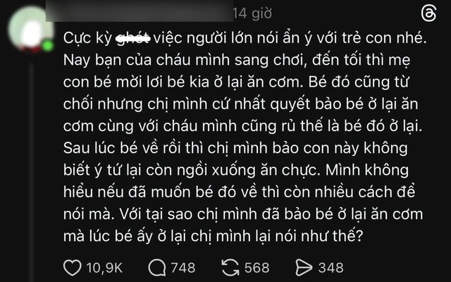 Dù đứa trẻ đã từ chối, nhưng người lớn vẫn nhất quyết giữ lại bằng được. Thế nhưng, ngay khi đứa trẻ ra về, chính người chị lại quay sang trách móc rằng: “Con này không biết ý tứ, lại còn ngồi xuống ăn chực”.