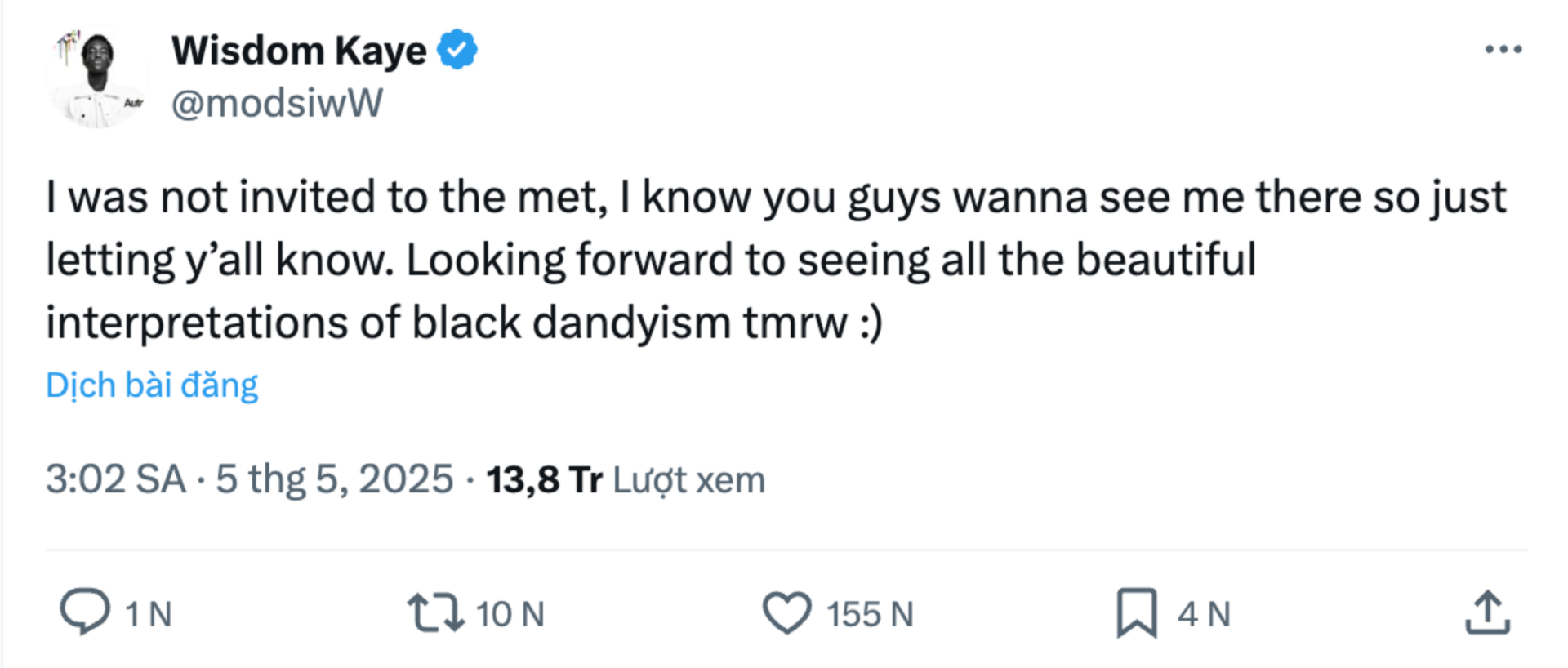Chia sẻ trên trang cá nhân của mình, Wisdom Kaye cho biết: "Tôi không được mời tới Met Gala. Tôi biết các bạn rất muốn thấy tôi xuất hiện ở đó nên chỉ muốn thông báo trước với mọi người. Rất mong chờ được chiêm ngưỡng những màn thể hiện tuyệt đẹp của chủ đề 'phong cách da màu' vào ngày mai".