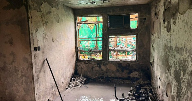 Nhiều căn phòng bị cháy đen hoàn toàn, tường và trần nhà bị ám khói nặng, tạo nên một không gian u ám, xám xịt. Nội thất và đồ đạc gia đình bị thiêu rụi, giờ chỉ còn trơ trụi những khung kim loại méo mó, không còn hình dạng ban đầu.