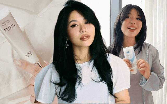 Ở mảng skincare, vị trí quan trọng nhất vẫn thuộc về kem chống nắng của Elixir Day Care Revolution. Theo An Phương, đây là kiểu sunscreen dành cho người thích lớp da tự nhiên: kiềm dầu vừa phải nhưng không lì, bề mặt căng bóng nhẹ kiểu glass skin, đặc biệt dễ hòa hợp với lớp nền phía sau. Dù dùng thêm cushion hay kem lót, sản phẩm vẫn tệp, không vón hay mốc - một tiêu chí khiến cô duy trì dùng xuyên suốt thay vì liên tục đổi sang loại mới.