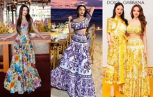 Đặc biệt, Huyền Baby không ngần ngại chi mạnh tay để sắm cả loạt set đồ gần giống nhau từ nhà mốt Dolce & Gabbana với giá khoảng 60 triệu đồng mỗi set. Từ sự kiện sang trọng đến những buổi dạo phố đời thường, cô đều biến tấu công thức crop top + chân váy dài để xuất hiện chỉn chu và thời thượng.