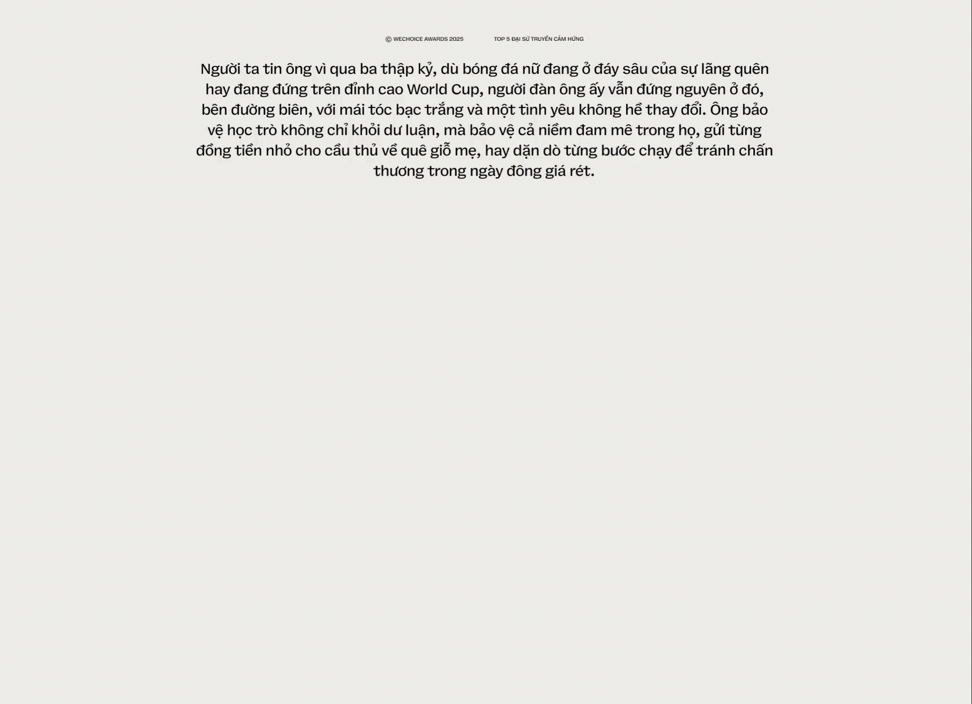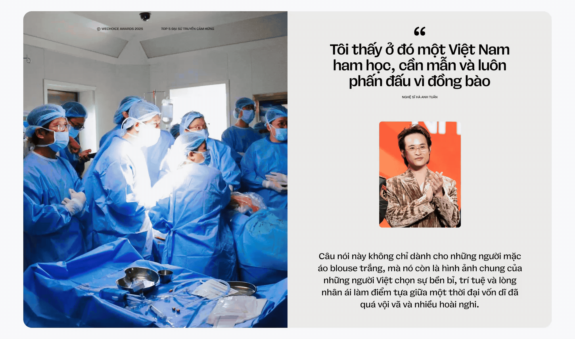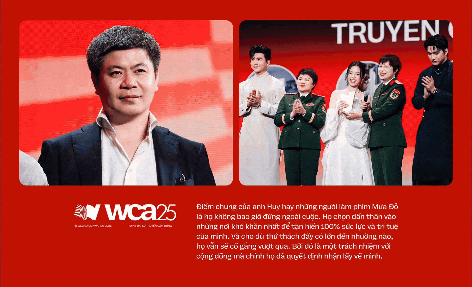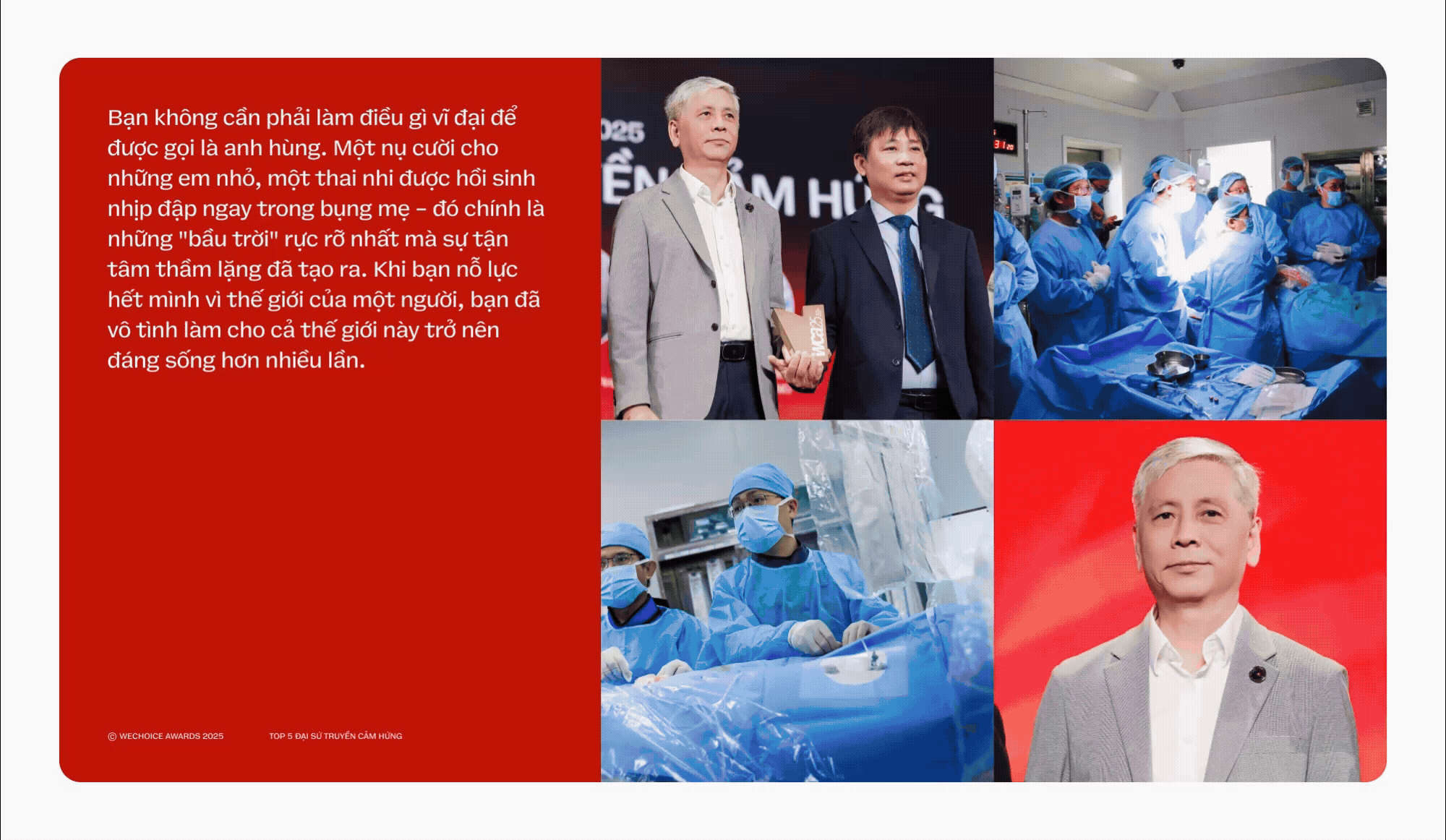 Phía sau giây phút vinh danh ấy là 16 năm chuẩn bị âm thầm của các bác sĩ, và nhìn rộng ra, đó cũng là nhịp đập chung của cả 5 Đại sứ truyền cảm hứng của WeChoice Awards năm nay. Họ đều là những người chọn gắn bó với công việc của mình bằng một tình yêu và niềm tin bền bỉ. Ta thấy HLV Mai Đức Chung - người "bác" già tóc bạc dành trọn 30 năm để chăm chút cho bóng đá nữ kể từ những ngày đầu tiên. Ta thấy Tiến sĩ Nguyễn Ngọc Huy, người miệt mài ngồi trước màn hình dữ liệu mỗi mùa bão lũ để cung cấp những thông tin hữu ích cho đồng bào. Ta gặp cô giáo Phấn 70 tuổi vẫn nâng niu từng nét chữ của những bệnh nhi ung thư, và đoàn phim Mưa Đỏ dấn thân suốt 81 ngày đêm để tri ân một thế hệ đã để lại máu xương nơi thành cổ Quảng Trị.