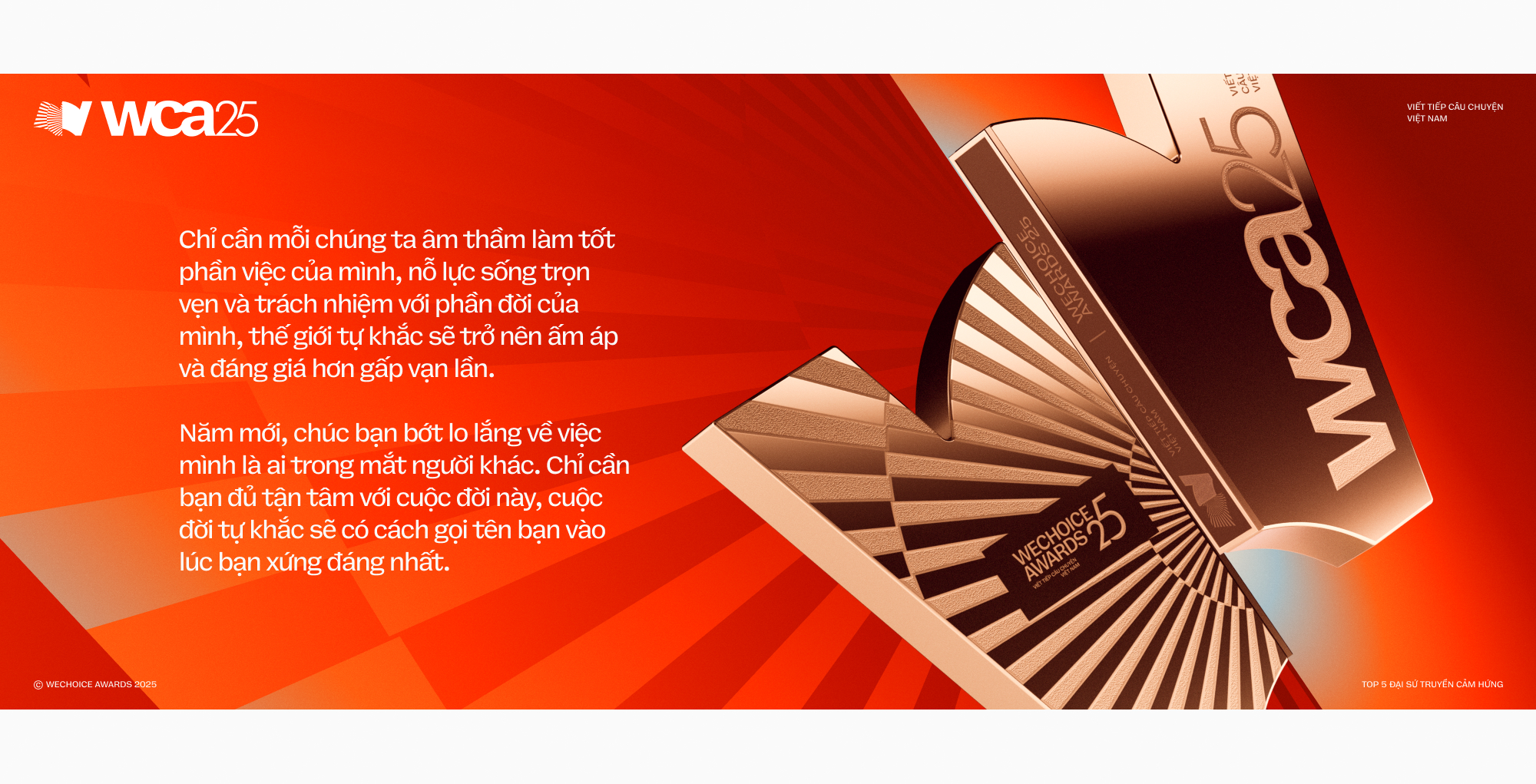 5 vị Đại sứ của WeChoice năm nay không rực rỡ nhờ ánh đèn sân khấu, mà chính sự tận tâm tự thân đã khiến họ tỏa sáng. Họ dạy chúng ta rằng uy tín không được xây bằng những danh xưng hào nhoáng, mà được xây bằng sự hiện diện bền bỉ qua hàng thập kỷ, dù là ở bên đường biên sân cỏ, trong phòng mổ hay giữa những lớp học nơi bệnh viện. Thông điệp "Viết tiếp câu chuyện Việt Nam" vì thế sẽ không nằm ở những điều gì quá vĩ mô. Nó nằm ngay ở đôi bàn tay và sự tử tế của mỗi con người.
