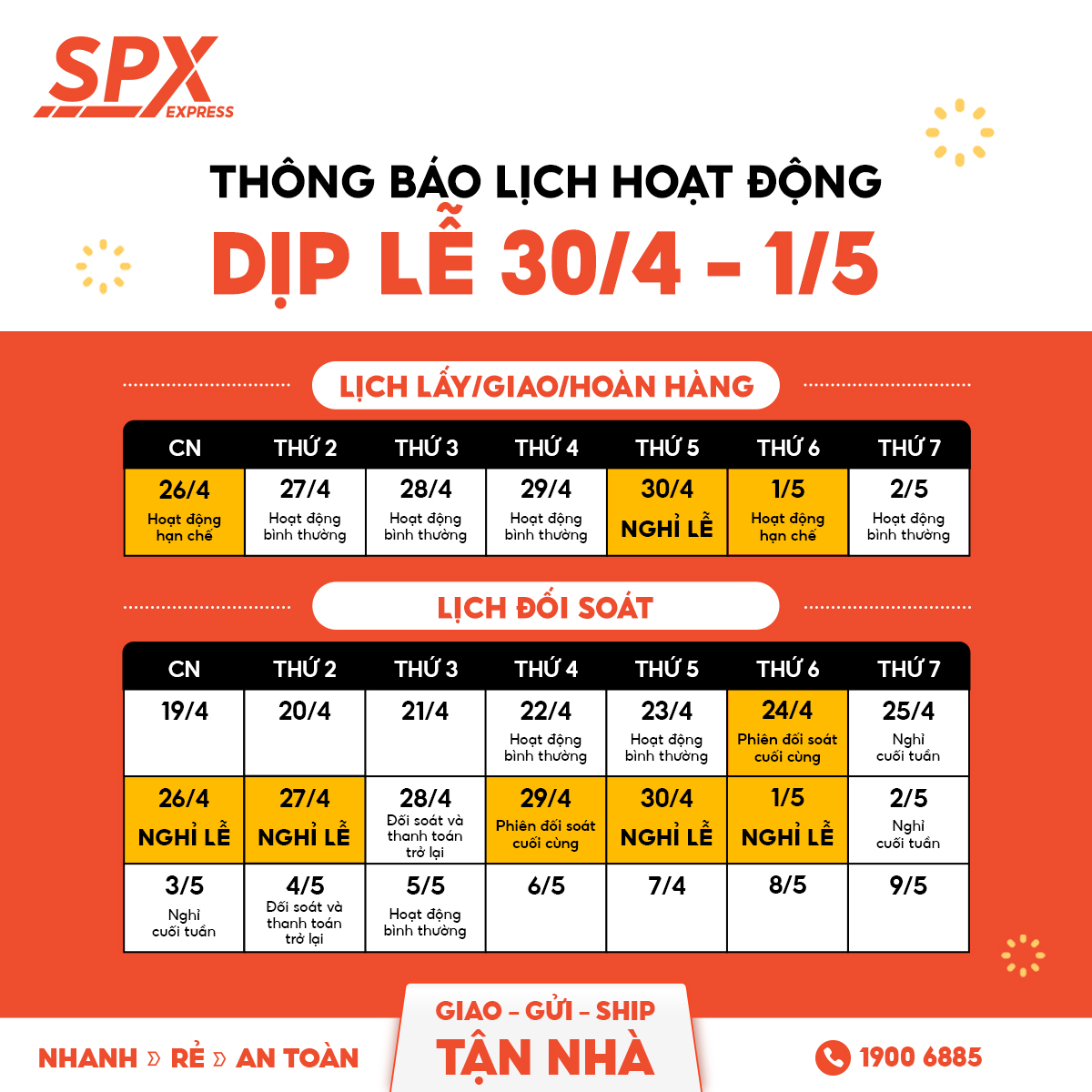 SPX Express cũng điều chỉnh lịch đối soát COD dịp lễ. Các đơn hoàn thành cuối tháng 4 sẽ được thanh toán sớm vào ngày 28 - 29/4 tùy hình thức đối soát của nhà bán hàng. Riêng toàn bộ đơn hoàn thành từ 29/4 đến 3/5 sẽ được đối soát đồng loạt vào ngày 4/5.