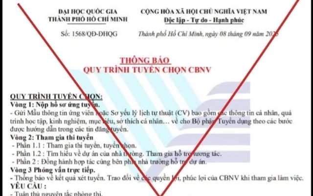 Đại học Quốc gia TPHCM khẳng định đây là những hành vi xâm phạm nghiêm trọng uy tín của đơn vị và có dấu hiệu vi phạm pháp luật. Toàn bộ thông tin liên quan đến tuyển dụng, hoạt động thiện nguyện và các thông báo chính thức chỉ được đăng tải trên website và fanpage chính thống của Đại học Quốc gia TPHCM.