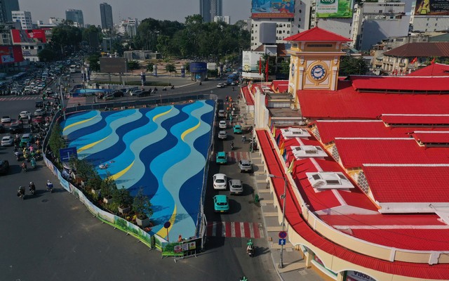 Quảng trường trước chợ được trang trí thêm nhiều tiểu cảnh rực rỡ, tạo không khí đón Tết. Đặc biệt, họa tiết sóng nước được vẽ trên mặt đất không chỉ mang tính thẩm mỹ mà còn gắn liền với văn hóa và lịch sử vùng Nam Bộ, với hệ thống kênh rạch đặc trưng và sự gắn kết với sông Bến Nghé xưa.