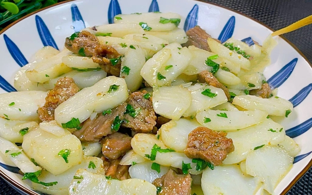 Mã thầy sau khi gọt vỏ sạch sẽ, bạn thái thành những lát dày khoảng 0.3cm. Đừng thái mỏng quá sẽ mất độ giòn, cũng đừng dày quá sẽ khó thấm gia vị. Thịt bò thái mỏng ngang thớ, ướp cùng chút gừng băm, bột năng, tiêu, nước tương và một thìa dầu ăn để giữ độ ẩm. Nếu muốn thịt bò mềm như ngoài hàng, bạn có thể thêm chút xíu baking soda (muối nở), nhưng chỉ một chút thôi nhé.