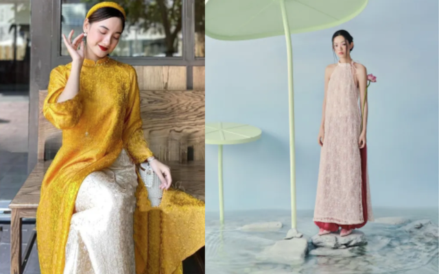 Một trong những thiết kế được tìm kiếm nhiều nhất là mẫu áo dài cổ yếm ren hoa Liên Dung và Lạc Anh. Thiết kế nhẹ nhàng, nữ tính, tạo cảm giác thanh thoát khi mặc. Form ôm vừa vặn, phần cổ yếm giúp tôn bờ vai và phần cổ cao, cực hợp khi diện trong dịp lễ Tết hay chụp ảnh xuân. Mẫu áo này đang được giảm còn 790.000 đồng, kèm voucher gian hàng 10 phần trăm và freeship toàn quốc, áp thêm voucher Max là có thể tiết kiệm thêm kha khá.