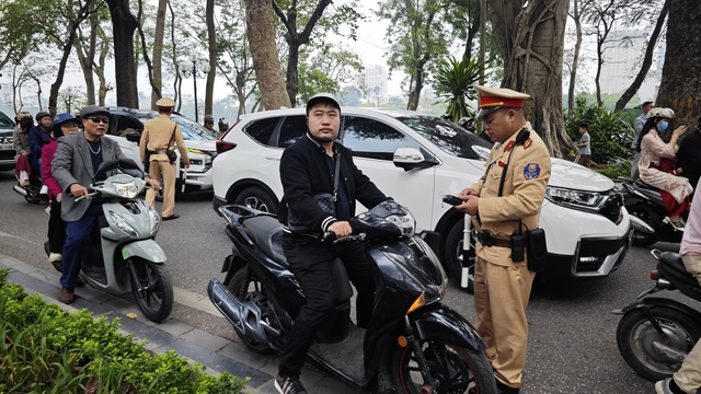 Ghi nhận trong sáng mùng 1, lực lượng CSGT tại Hà Nội đã tổ chức kiểm tra nồng độ cồn tại một số tuyến phố trung tâm. Khoảng 10h, một tổ công tác lập chốt tại khu vực Hồ Gươm, tiến hành dừng phương tiện theo đúng quy trình.