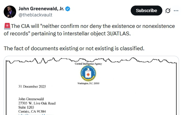 Trong bài đăng mới nhất trên nền tảng Medium, Loeb đã đề cập đến câu trả lời mà nhà nghiên cứu UFO John Greenewald Jr. nhận được từ CIA. Khi phản hồi yêu cầu về quyền tự do thông tin của Greenewald Jr., cơ quan tình báo Mỹ tuyên bố họ không thể xác nhận cũng như phủ nhận sự tồn tại hoặc không tồn tại của các hồ sơ liên quan đến 3I/ATLAS.