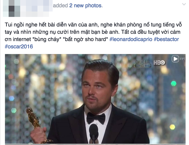Giây phút cái tên Leonardo DiCaprio được xướng lên, cả thế giới reo hò vui sướng như đây chính là niềm vui của nhân loại không riêng gì bản thân tài tử tuyệt vời này! Sau 22 năm, còn niềm vui nào lớn hơn khi thấy chàng Leo cuối cùng cũng được "chiếu cố" tại lễ trao giải điện ảnh danh giá nhất toàn cầu này. Hòa cùng không khí hân hoan của giây phút Leo được xướng danh, cư dân mạng khắp nơi cũng bày tỏ niềm vui khôn siết!