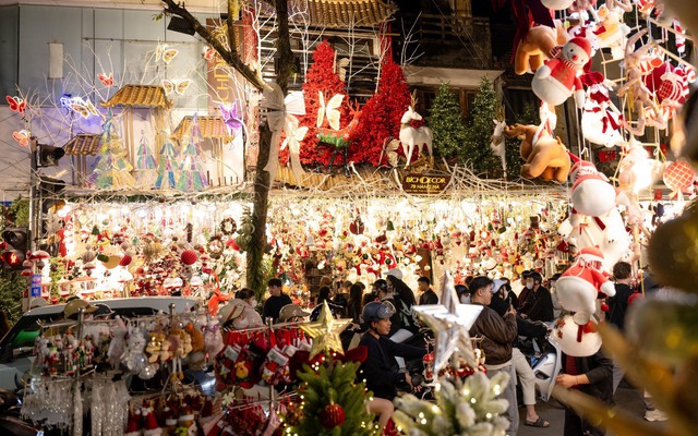 Từ đầu phố, tiếng nhạc Giáng sinh rộn ràng vang lên, hoà vào đó là không khí náo nhiệt… tạo nên cảm giác rất đặc trưng mà chỉ Hàng Mã mới có. Dưới ánh đèn lấp lánh hắt từ các dãy nhà 2 bên đường, những món đồ trang trí lại càng thêm long lanh: quả châu đỏ bóng, dây kim tuyến lấp lánh, những chú tuần lộc phủ nhũ, mũ Noel đủ size, dây đèn LED chạy theo hình cây thông… tất cả hòa vào nhau thành biển màu sắc lung linh.