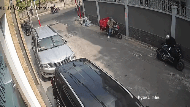 Sau đó, người này cầm 2 đơn hàng đi bộ giao cho khách ở 2 căn nhà đầu hẻm. Lúc này có người đàn ông lạ mặt đi bộ ngang qua thấy xe máy cùng giỏ hàng để trong hẻm, chìa khóa vẫn cắm trên xe nên tiếp cận. Người này liền bật chìa khóa lên rồi nổ máy rời đi cùng giỏ hàng.