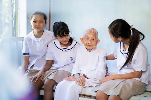Các bạn nhỏ của mái ấm Tre Xanh và Hoa Hồng Nhỏ đến thăm các cụ ở Trung tâm dưỡng lão Thị Nghè.