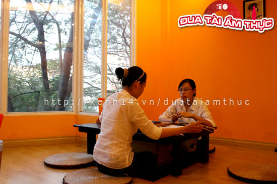 Không chỉ vì cách ăn quá ư đặc biệt như thế, nghe tuy có phần vất vả nếu bạn thuộc tuýp người ghét tự phục vụ. Tuy nhiên nhìn chung, theo hướng lạc quan hơn thì đây là cái đầu tiên khiến bạn phải mê mẩn nó, chỉ một từ để hình dung đó là “lạ”. Chưa kể đến cách sắp xếp bàn ghế, phòng ốc khang trang, xì- tin sáng sủa và mát mẻ. Bàn thuộc loại bàn vuông và không có ghế. Ở đây muốn ngồi chỉ đơn giản là một tấm thảm mềm tròn lót đất, còn khi ngồi thì do thiết kế của cái bàn là được khoét một lỗ hình vuông dưới đất thấp hơn nền nhà. Chính vì vậy mà bạn có để thòng chân xuống thoải mái vô cùng.