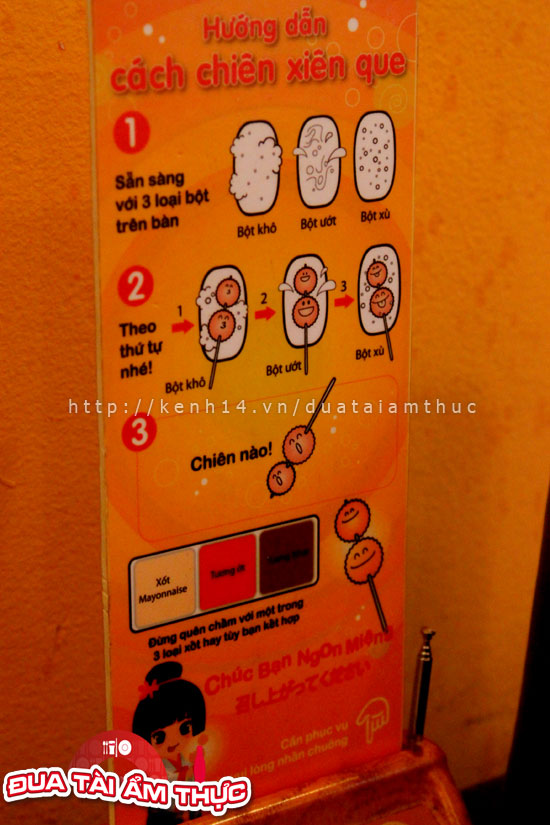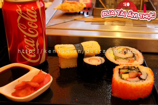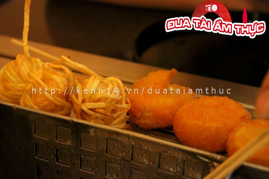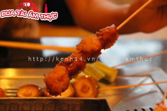 Các món ăn ở đây đều đã được xiên hết vào que với các món sushi, chả cá, tôm, mực, tôm nhồi kem, chả cá song hỷ, và còn rất nhiều các loại rau, củ, nấm xiên que… Khi đến đây bạn cứ thích món nào thì gắp món đó rồi đến quầy tính tiền. Còn việc chiên, nướng thì đã có sẵn dưới bàn một cái bếp đầy chảo nóng cho bạn tự chế biến theo ý thích của mình. Giá trung bình là từ 5k đến 15k một que tuỳ theo món ăn nhá.