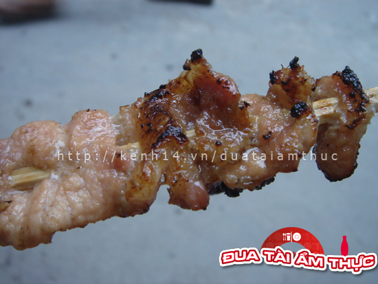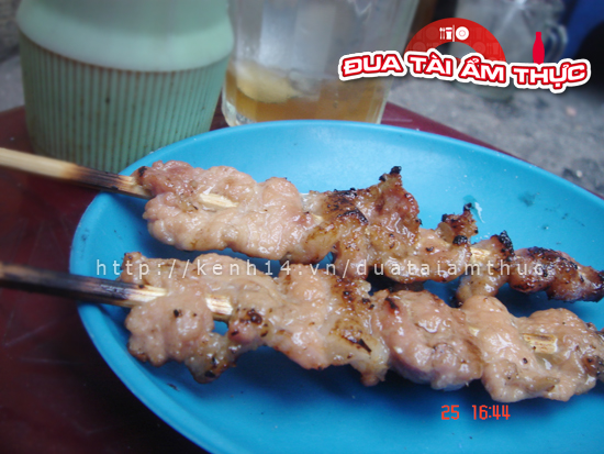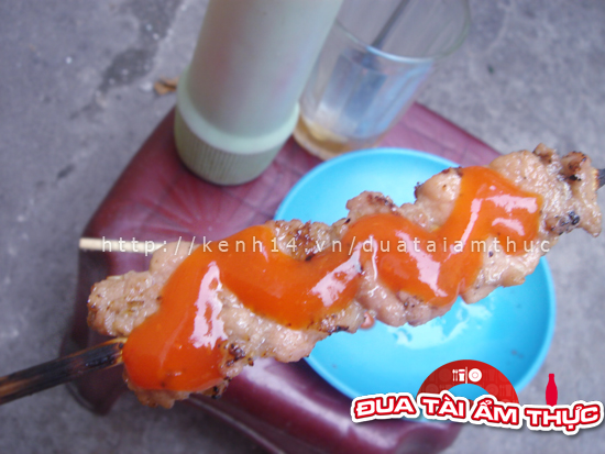 Bên cạnh đó, ở đây còn có hai món ăn nóng đó là thịt xiên nướng và nem chua rán. Nem chua rán ở đây là nem chua tẩm bột, có lẽ không ngon bằng các quán nem chua rán nổi tiếng khác, nhưng ăn cũng khá được. Còn thịt xiên nướng ở đây thì đắt hàng lắm nhé, đôi khi đến hơi muộn một chút là không còn cơ hội để thưởng thức rồi. Thịt xiên nướng ở đây không quá dày, được tẩm ướp rất đậm đà và nướng cũng vừa tới. Bạn nào thích ăn cay thì chỉ cần cho thêm một chút ớt thì cực ngon luôn đấy. Ăn khai vị bằng một cốc thạch rồi thêm vài xiên thịt nướng là quá tuyệt vời cho một bữa ăn vặt còn gì.