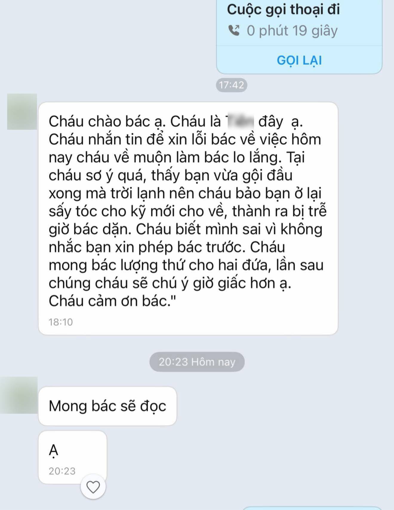 Câu chuyện trở nên sống động hơn khi chị chia sẻ về bé T. bạn của con gái mình. Sau một buổi đi chơi về muộn khiến chị không hài lòng, bé T. đã trực tiếp xin lỗi ngay lúc ấy. Chưa dừng lại, khi về đến nhà, cô bé còn gửi một tin nhắn dài tràn đầy sự chân thành: "Cháu nhắn tin xin lỗi bác vì việc hôm nay cháu về muộn làm bác lo lắng… Cháu sơ ý quá… Cháu mong bác lượng thứ cho hai đứa… Cháu cảm ơn bác".