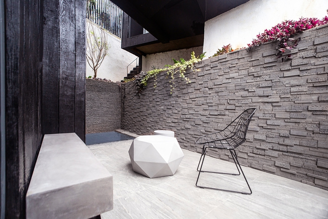 Ngôi nhà tọa lạc trong một khu dân cư yên tĩnh trên đồi tại Đà Lạt. Ẩn núp 1,2m so với mặt đường, mặt tiền nhà là một hàng rào gạch bê tông xếp chồng so le không được sơn phết hay tô vẽ. Phần ngoại thất nặng nề với gỗ thui (Shou Sugi Ban) bao bọc phần lớn bề mặt căn nhà và chào đón khách viếng bằng một dải cửa sổ mỏng lạnh lùng. Cái tên The Bunker (Lô cốt quân sự) cũng được đặt cho ngôi nhà vì lý do này. Căn nhà có vẻ bề ngoài lãnh đạm và đơn điệu nhưng lại thể hiện trọn vẹn vẻ đẹp bên trong tính cách, cuộc sống tinh thần của gia đình.