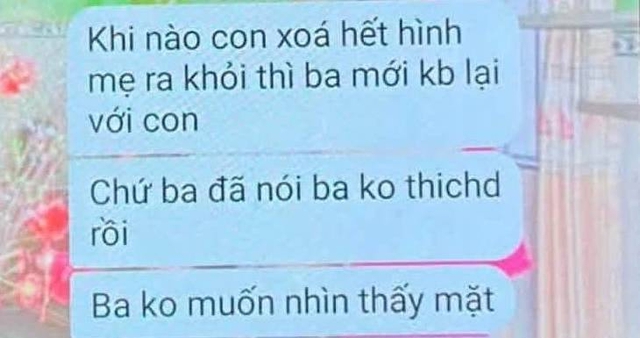 Đính kèm là đoạn tin nhắn được cho là người bố gửi con gái. Trong đó, người này khuyên con gỡ ảnh bìa xuống thay ảnh khác vì ông bà nội và ba mẹ không thích. "Khi nào con xoá hết hình mẹ ra khỏi thì ba mới kết bạn lại với con", người này nhắn. Đồng thời ông bố cũng cho rằng, mình mua điện thoại cho con là để kết nối liên lạc chứ không phải làm điều mình không thích.