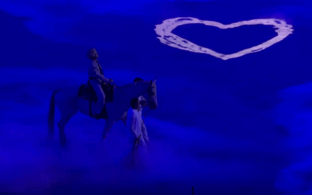 Hình ảnh con ngựa trắng chậm rãi đưa anh vào trung tâm biểu diễn tạo nên khoảnh khắc vừa choáng ngợp vừa thi vị