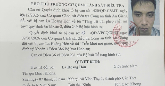 Bị can La Hoàng Hôn cùng 3 bị can chung buồng giam đã trốn khỏi nơi giam giữ ở tỉnh An Giang nên bị truy nã toàn quốc