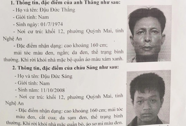 Ngày 26/2, Công an phường Quỳnh Mai (Nghệ An) phát đi thông báo tìm ông Đậu Đức Thắng (SN 1974) và con trai Đậu Đức Sáng (SN 2008, cùng trú tại khối 12, phường Quỳnh Mai).
