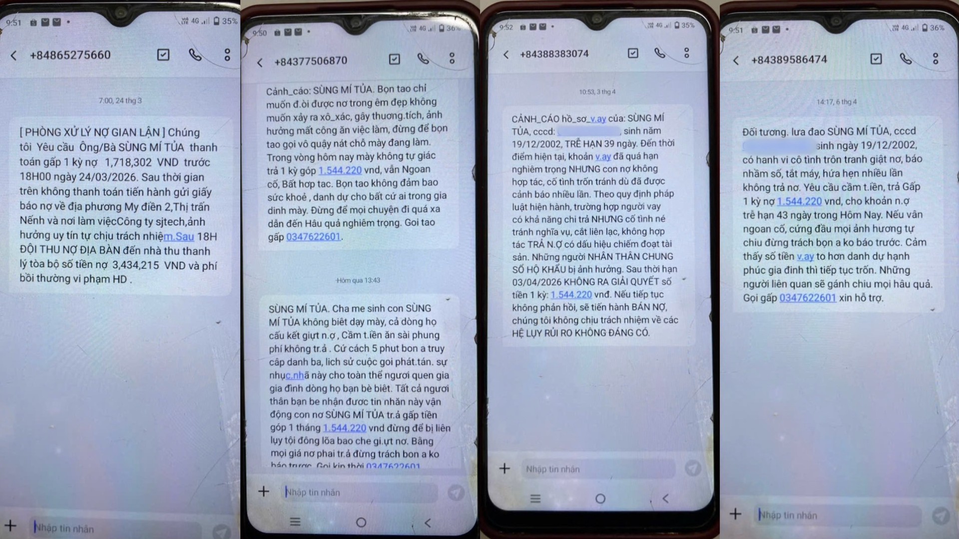 Trước đó, vào ngày 8/4/2026, anh Sùng Mí Tủa (sinh năm 2002, dân tộc Mông, trú tại xã Du Già) nhận được nhiều cuộc gọi và tin nhắn từ một số điện thoại lạ. Đối tượng tự xưng anh Tủa đang có khoản vay chưa thanh toán và yêu cầu chuyển tiền vào tài khoản do chúng cung cấp. Đồng thời, đối tượng đe dọa sẽ liên hệ, gây áp lực với người thân của anh nếu không thực hiện theo yêu cầu.