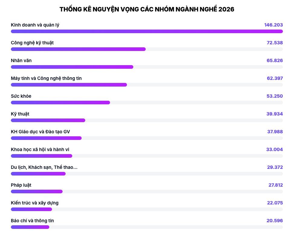 Trong danh sách 12 nhóm ngành được nhiều thí sinh lựa chọn nhất năm 2025, các lĩnh vực còn lại cũng ghi nhận tỷ lệ ổn định, bao gồm: Nhân văn (9,6%), Máy tính và công nghệ thông tin (9,2%), Sức khỏe (7,8%), Kỹ thuật, Khoa học và đào tạo giáo viên (5,8%), Khoa học xã hội và hành vi (4,8%),...