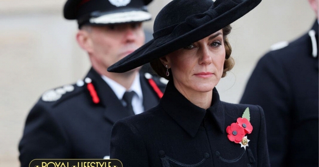 Cô mặc chiếc áo khoác kiểu quân phục được thiết kế riêng của Catherine Walker, với những chi tiết bện tinh tế, gợi nhớ đến Áo khoác Chỉ huy (Officer’s Jacket). Đây là chiếc áo mà cô từng mặc vào năm 2019 khi đứng cạnh Nữ hoàng Elizabeth. Vương phi kết hợp với một chiếc mũ rộng vành kịch tính của Philip Treacy, giữ vững sự thanh lịch nhưng không làm lu mờ ý nghĩa của sự kiện.