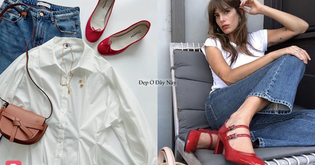 Nếu áo trắng và quần jeans là nền tảng, thì giày đỏ chính là "linh hồn" của set đồ. Một đôi giày đỏ - dù là búp bê, cao gót hay sneaker - đều có khả năng làm bừng sáng cả tổng thể. Màu đỏ không chỉ tạo điểm nhấn nổi bật, mà còn mang lại cảm giác tươi trẻ, tràn đầy năng lượng. Đây cũng là chi tiết giúp bộ trang phục trở nên thú vị hơn, tránh sự đơn điệu của hai gam màu trung tính.