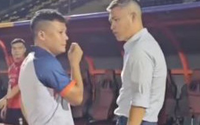 Công Vinh chào hỏi HLV Văn Sỹ Sơn và nói chuyện cùng trợ lý HLV Văn Quyến (Ảnh: Bongdadoisong)
