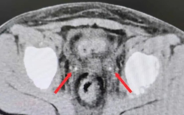 Chuyển đến Bệnh viện Nhi đồng 2 trong tình trạng không có nước tiểu, siêu âm không thấy nước tiểu trong bàng quang. Kết quả CT bụng không cản quang ghi nhận thận ứ nước hai bên, niệu quản giãn và sỏi kẹt đoạn cuối hai bên (phải 3x7mm, trái 3x20mm). Bệnh nhi được mổ cấp cứu trong đêm, nội soi bàng quang đặt ống thông JJ ngược dòng hai bên.