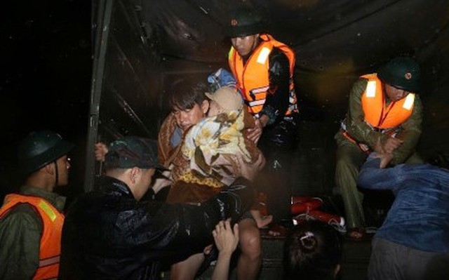 Lực lượng cứu hộ trắng đêm hỗ trợ người dân thoát khỏi vùng ngập lũ.