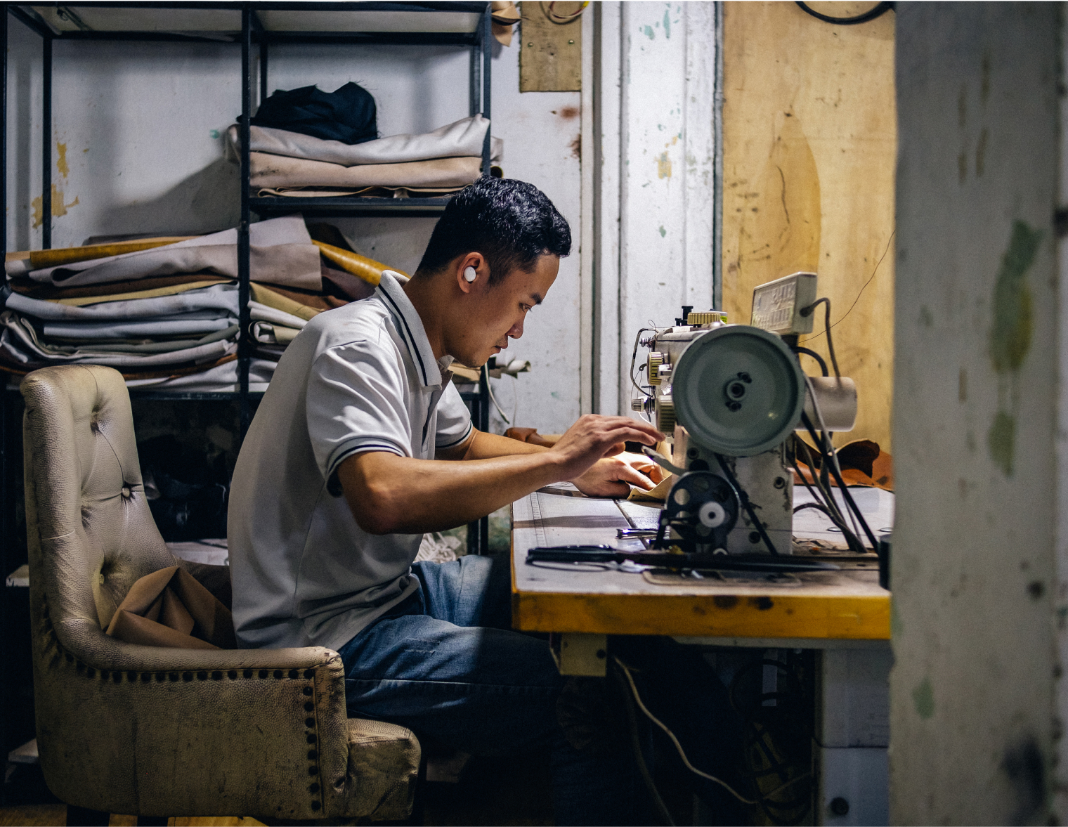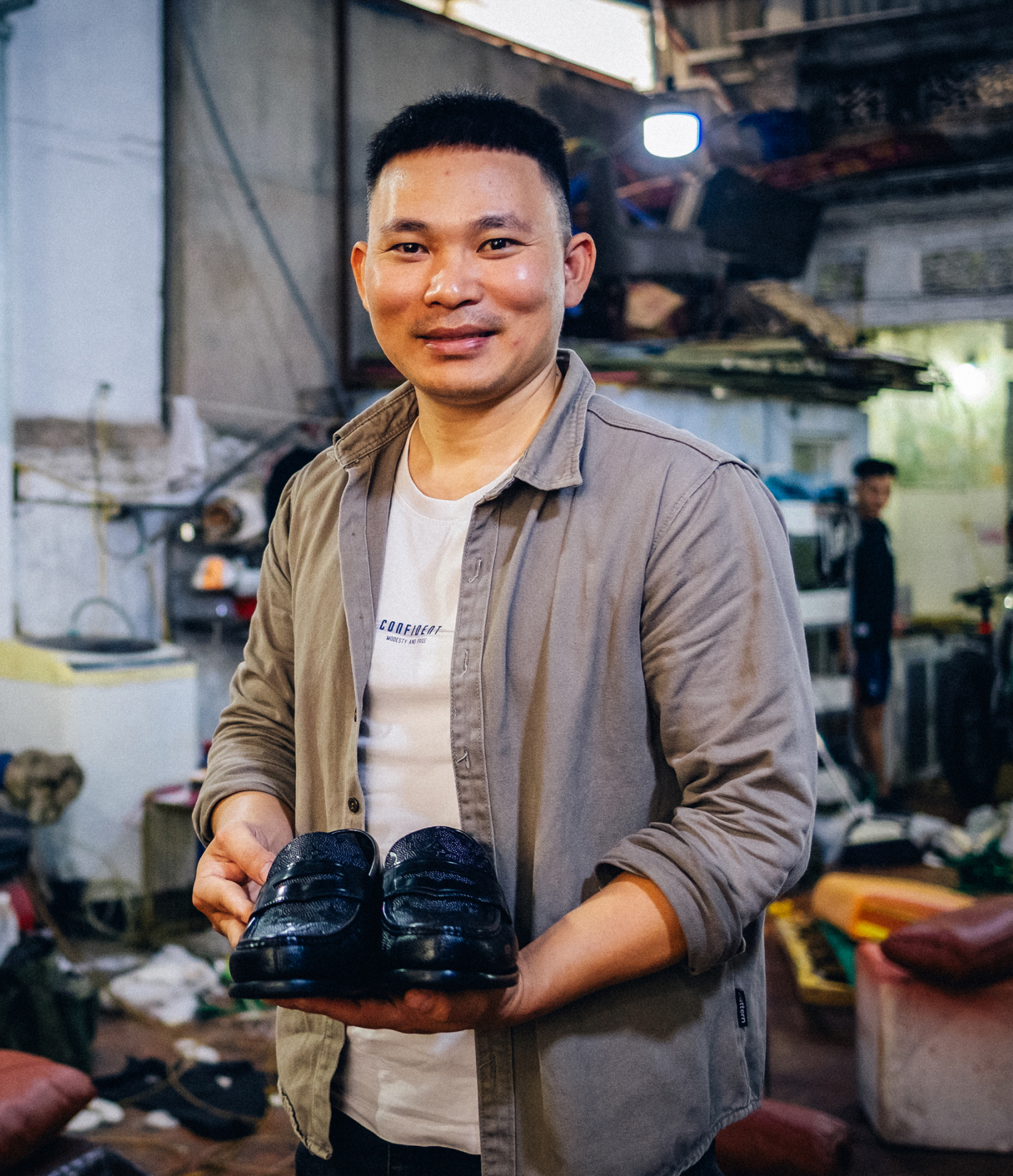 Ban ngày, cả hai loay hoay sửa chữa đồ da cho khách. Tối đến, mỗi người một nơi, người làm xe ôm, người đi đánh giày, làm phục vụ để trang trải cuộc sống vì khách ở xưởng đồ da chỉ có vài người quen ủng hộ.