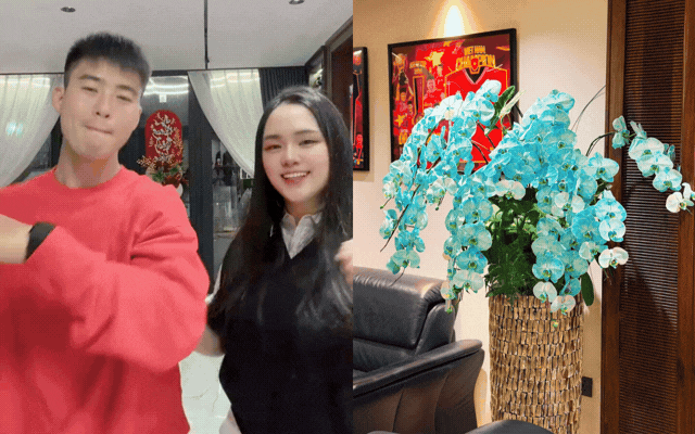 Những ngày đầu năm, căn nhà ngập tràn sắc hoa. Những chậu lan hồ điệp xanh nổi bật được đặt trang trọng trong phòng khách, kết hợp cùng hoa đào và các vật dụng trang trí Tết mang sắc màu rực rỡ. Không khí xuân hiện diện trong từng chi tiết, tạo nên khung cảnh vừa sang xịn vừa gần gũi.