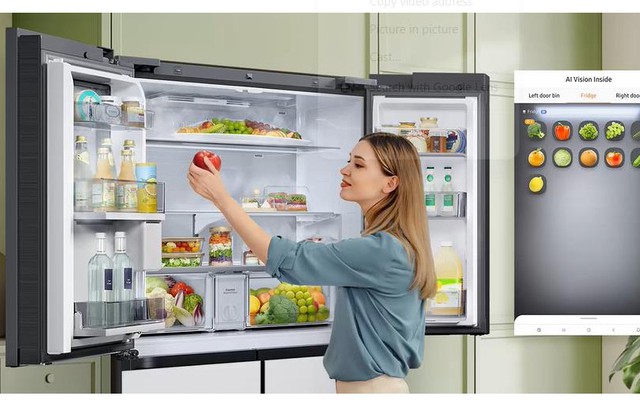 Samsung cũng tích hợp AI vào tủ lạnh giúp người dùng có thể quản lý thực phẩm dễ dàng. Ví dụ, tính năng AI Vision Inside trên mẫu tủ lạnh cao cấp Bespoke AI Family Hub sử dụng camera bên trong để nhận diện các loại thực phẩm tươi sống được đưa vào và lấy ra khỏi tủ, giúp người dùng quản lý danh sách thực phẩm bằng cách xem thực phẩm đang có, nhận gợi ý công thức nấu ăn hoặc thông báo khi đến hạn.